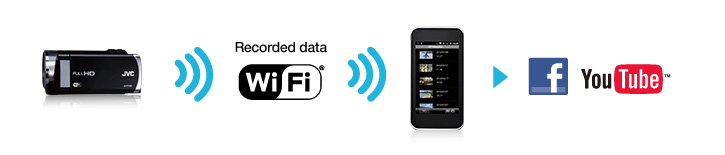Access the Everio via a smartphone with an app and download recorded video and stills as you like. After that, you can easily upload them to your favorite sites like YouTube™ or Facebook using a smartphone.