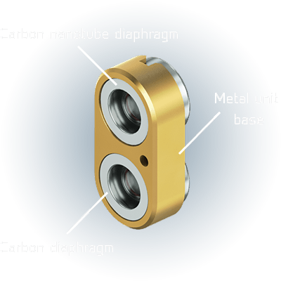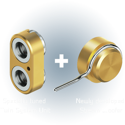 The depth and realistic presence of the Twin System Unit is produced by two drivers specially tuned to optimally drive the mid and high acoustic range characteristics and integrated in parallel in the metal unit base.